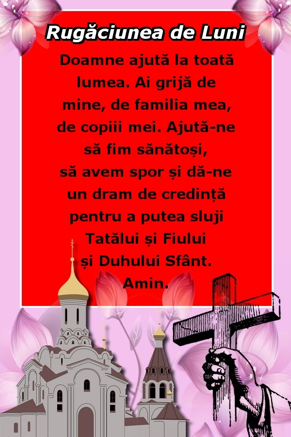 Fie ca această rugăciune de luni cu cu textul frumos Doamne ajută la toată lumea. Ai grijă de mine, de familia mea, de copiii mei. Ajută-ne să fim sănătoși, să avem spor și dă-ne un dram de credință pentru a putea sluji Tatălui și Fiului și Duhului Sfânt. Amin. să vă ofere confortul și ghidarea de care aveți nevoie pentru a aborda cu încredere toate provocările și binecuvântările săptămânii care începe.