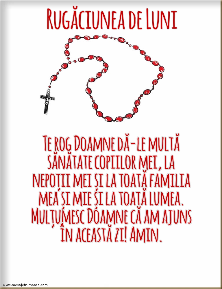 Fie ca această rugăciune de luni cu cu textul frumos Te rog Doamne dă-le multă sănătate copiilor mei, la nepoții mei și la toată familia mea și mie și la toată lumea. Mulțumesc Doamne că am ajuns în această zi! Amin. să vă ofere confortul și ghidarea de care aveți nevoie pentru a aborda cu încredere toate provocările și binecuvântările săptămânii care începe.