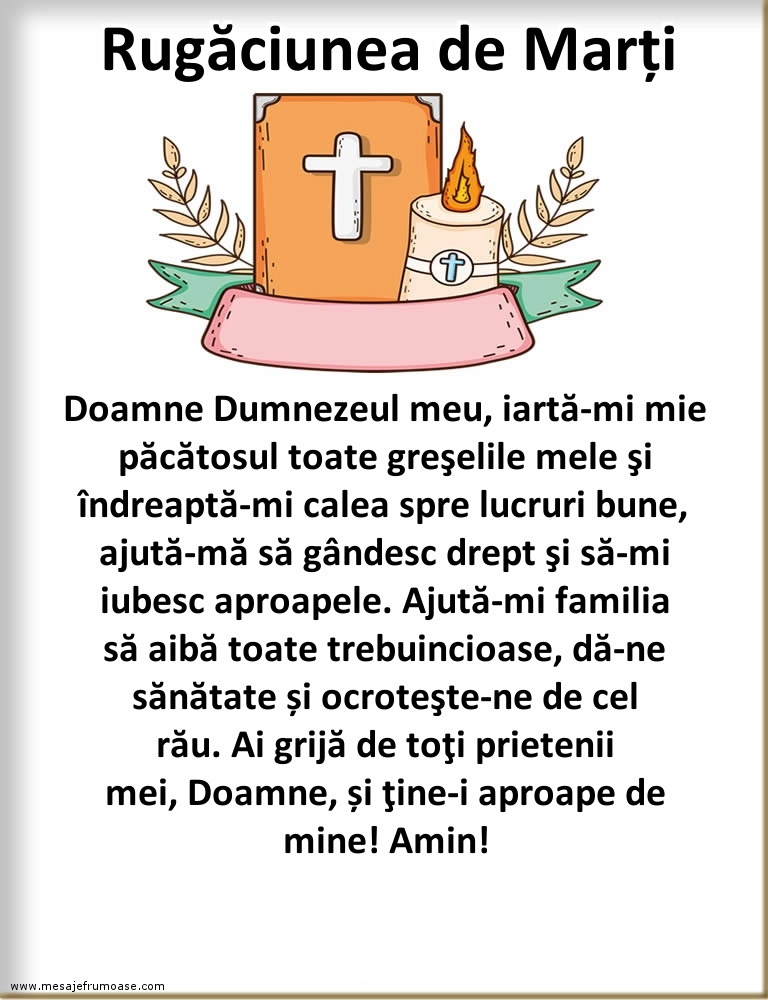 Marțea este adesea văzută ca o zi de acțiune și direcție, iar această rugăciune de marți cu textul frumos Doamne Dumnezeul meu, iartă-mi mie păcătosul toate greşelile mele şi îndreaptă-mi calea spre lucruri bune, ajută-mă să gândesc drept şi să-mi iubesc aproapele. Ajută-mi familia să aibă toate trebuincioase, dă-ne sănătate și ocroteşte-ne de cel rău. Ai grijă de toţi prietenii mei, Doamne, și ţine-i aproape de mine! Amin! este creată pentru a ne aminti să ne ancorăm în credință și speranță în mijlocul agitației zilelor noastre.