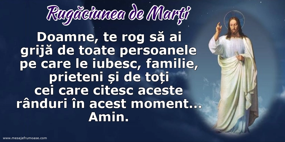 Marțea este adesea văzută ca o zi de acțiune și direcție, iar această rugăciune de marți cu textul frumos Doamne, te rog să ai grijă de toate persoanele pe care le iubesc, familie, prieteni și de toți cei care citesc aceste rânduri în acest moment... Amin. este creată pentru a ne aminti să ne ancorăm în credință și speranță în mijlocul agitației zilelor noastre.