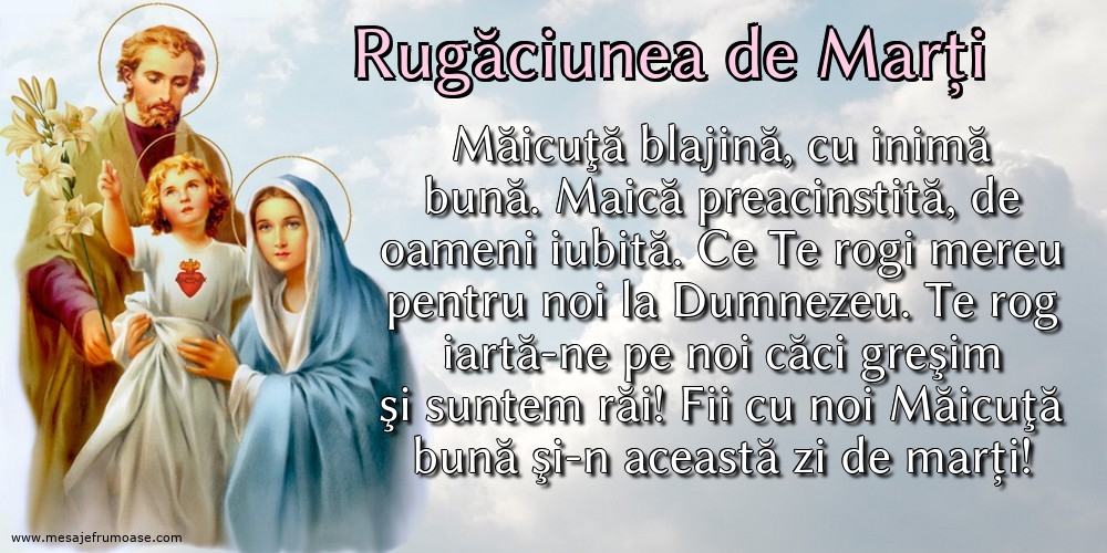 Marțea este adesea văzută ca o zi de acțiune și direcție, iar această rugăciune de marți cu textul frumos Măicuţă blajină, cu inimă bună. Maică preacinstită, de oameni iubită. Ce Te rogi mereu pentru noi la Dumnezeu. Te rog iartă-ne pe noi căci greşim şi suntem răi! Fii cu noi Măicuţă bună şi-n această zi de marți! este creată pentru a ne aminti să ne ancorăm în credință și speranță în mijlocul agitației zilelor noastre.