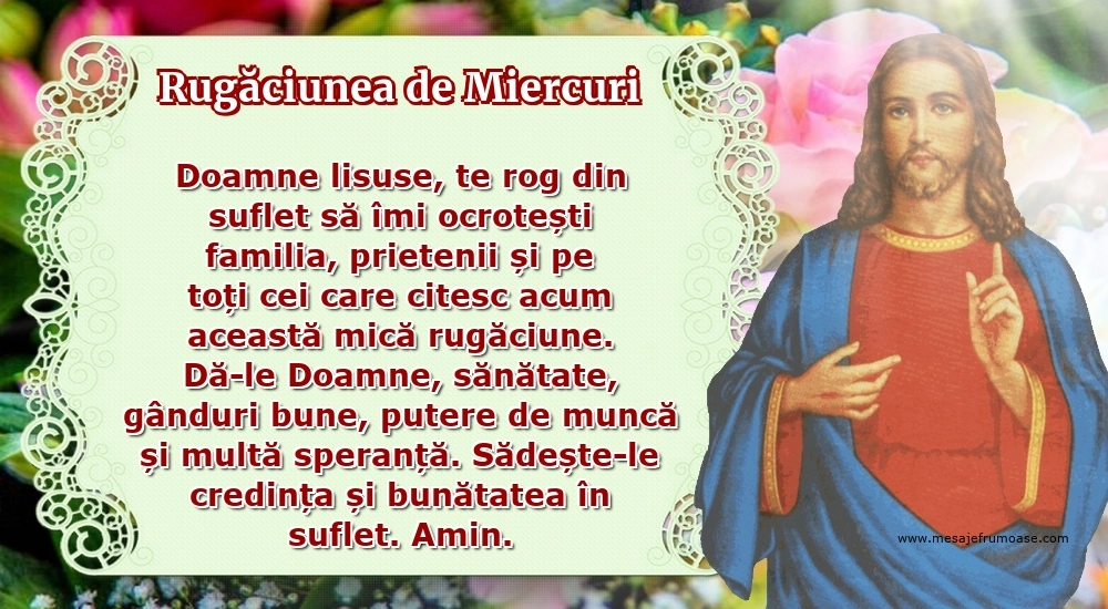 Această rugăciune de miercuri cu textul frumos Doamne lisuse, te rog din suflet să îmi ocrotești familia, prietenii și pe toți cei care citesc acum această mică rugăciune. Dă-le Doamne, sănătate, gânduri bune, putere de muncă și multă speranță. Sădește-le credința și bunătatea în suflet. Amin. ne îndeamnă să ne exprimăm recunoștința pentru darurile vieții și să căutăm echilibrul și armonia în sufletul nostru.