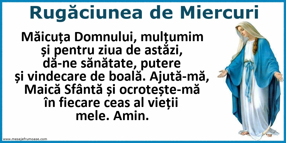 Această rugăciune de miercuri cu textul frumos Măicuța Domnului, mulțumim și pentru ziua de astăzi, dă-ne sănătate, putere și vindecare de boală. Ajută-mă, Maică Sfântă și ocrotește-mă în fiecare ceas al vieții mele. Amin. ne îndeamnă să ne exprimăm recunoștința pentru darurile vieții și să căutăm echilibrul și armonia în sufletul nostru.