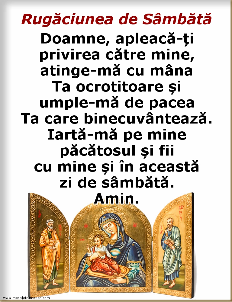 Această rugăciune de sâmbătă cu textul frumos Doamne, apleacă-ți privirea către mine, atinge-mă cu mâna Ta ocrotitoare și umple-mă de pacea Ta care binecuvântează. Iartă-mă pe mine păcătosul și fii cu mine și în această zi de sâmbătă. Amin. ne îndeamnă să ne amintim de frumusețea și trecerea timpului, să ne exprimăm recunoștința pentru darurile vieții și să ne rugăm pentru întreținerea și binecuvântarea noastră în zilele ce urmează.