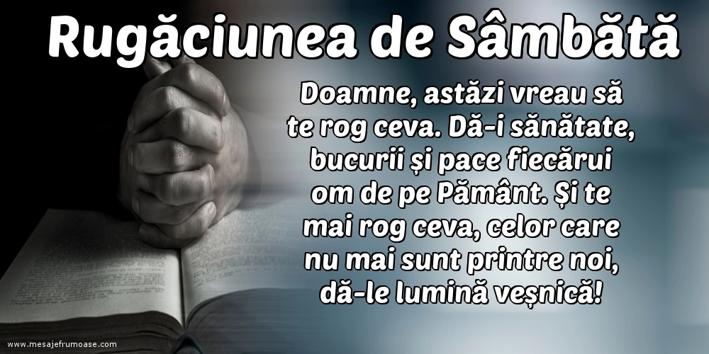 Această rugăciune de sâmbătă cu textul frumos Doamne, astăzi vreau să te rog ceva. Dă-i sănătate, bucurii și pace fiecărui om de pe Pământ. Și te mai rog ceva, celor care nu mai sunt printre noi, dă-le lumină veșnică! ne îndeamnă să ne amintim de frumusețea și trecerea timpului, să ne exprimăm recunoștința pentru darurile vieții și să ne rugăm pentru întreținerea și binecuvântarea noastră în zilele ce urmează.