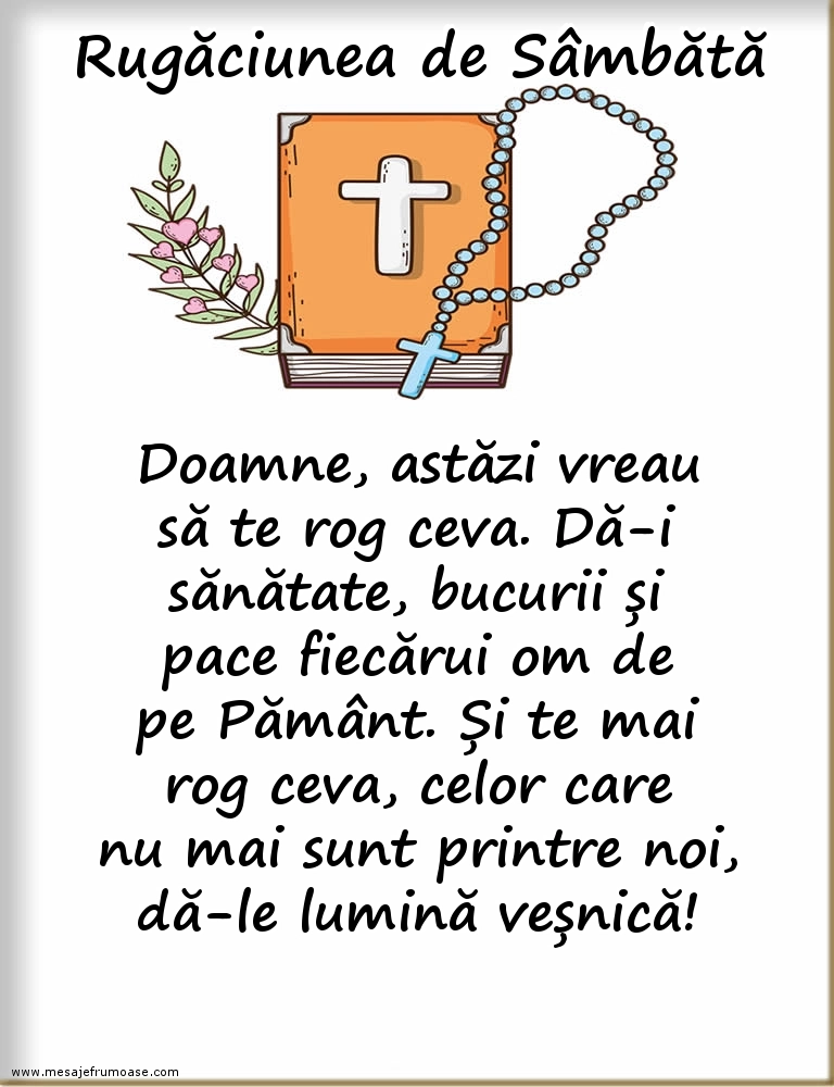 Această rugăciune de sâmbătă cu textul frumos Doamne, astăzi vreau să te rog ceva. Dă-i sănătate, bucurii și pace fiecărui om de pe Pământ. Și te mai rog ceva, celor care nu mai sunt printre noi, dă-le lumină veșnică! ne îndeamnă să ne amintim de frumusețea și trecerea timpului, să ne exprimăm recunoștința pentru darurile vieții și să ne rugăm pentru întreținerea și binecuvântarea noastră în zilele ce urmează.