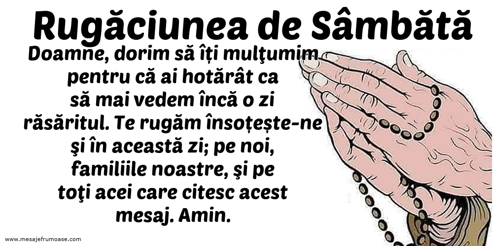 Această rugăciune de sâmbătă cu textul frumos Doamne, dorim să îți mulţumim pentru că ai hotărât ca să mai vedem încă o zi răsăritul. Te rugăm însoțește-ne şi în această zi; pe noi, familiile noastre, şi pe toţi acei care citesc acest mesaj. Amin. ne îndeamnă să ne amintim de frumusețea și trecerea timpului, să ne exprimăm recunoștința pentru darurile vieții și să ne rugăm pentru întreținerea și binecuvântarea noastră în zilele ce urmează.