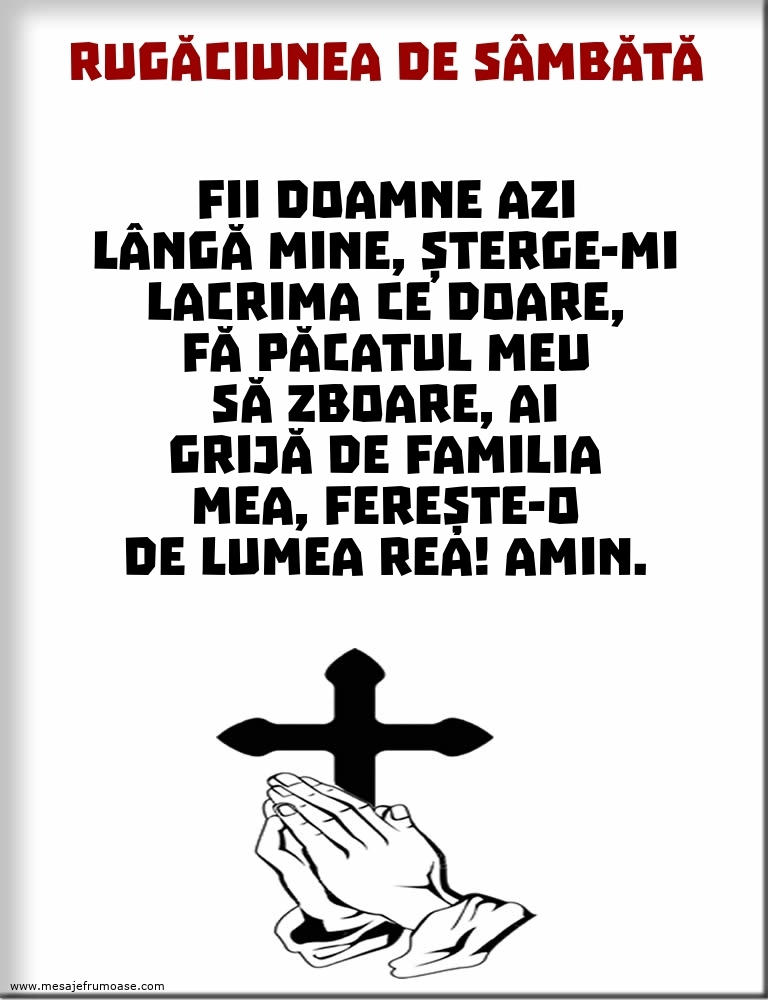 Această rugăciune de sâmbătă cu textul frumos Fii Doamne azi lângă mine, șterge-mi lacrima ce doare, fă păcatul meu să zboare, ai grijă de familia mea, ferește-o de lumea rea! Amin. ne îndeamnă să ne amintim de frumusețea și trecerea timpului, să ne exprimăm recunoștința pentru darurile vieții și să ne rugăm pentru întreținerea și binecuvântarea noastră în zilele ce urmează.
