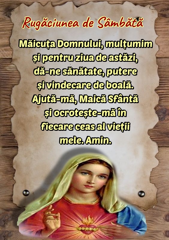 Această rugăciune de sâmbătă cu textul frumos Măicuța Domnului, mulțumim și pentru ziua de astăzi, dă-ne sănătate, putere și vindecare de boală. Ajută-mă, Maică Sfântă și ocrotește-mă în fiecare ceas al vieții mele. Amin. ne îndeamnă să ne amintim de frumusețea și trecerea timpului, să ne exprimăm recunoștința pentru darurile vieții și să ne rugăm pentru întreținerea și binecuvântarea noastră în zilele ce urmează.