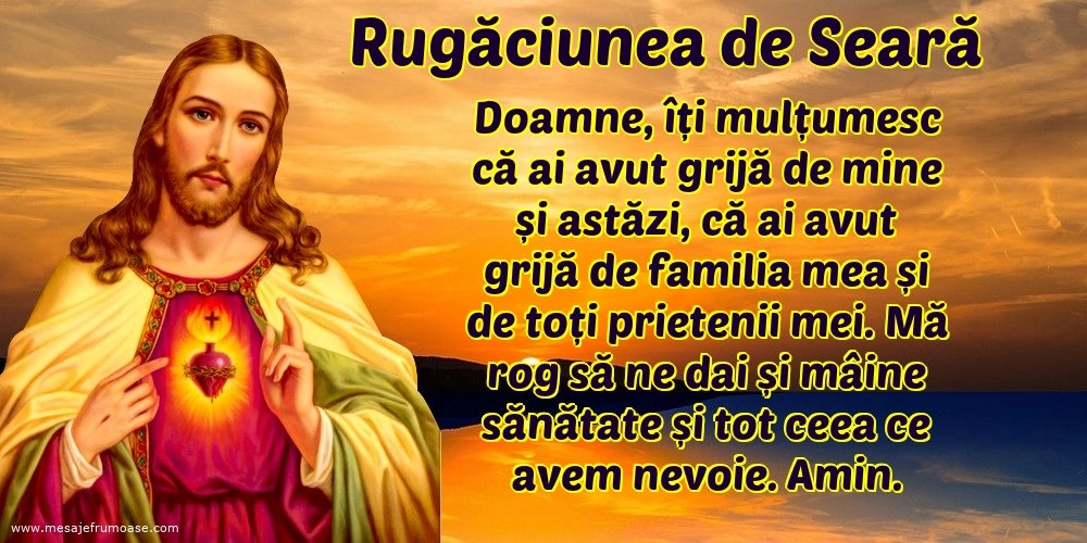 Doamne, îți mulțumesc că ai avut grijă de mine și astăzi, că ai avut grijă de familia mea și de toți prietenii mei. Mă rog să ne dai și mâine sănătate și tot ceea ce avem nevoie. Amin.