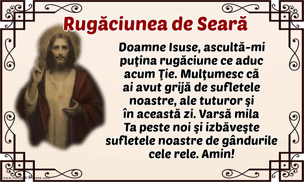 Doamne Isuse, ascultă-mi puţina rugăciune ce aduc acum Ţie. Mulţumesc că ai avut grijă de sufletele noastre, ale tuturor şi în această zi. Varsă mila Ta peste noi şi izbăveşte sufletele noastre de gândurile cele rele. Amin!