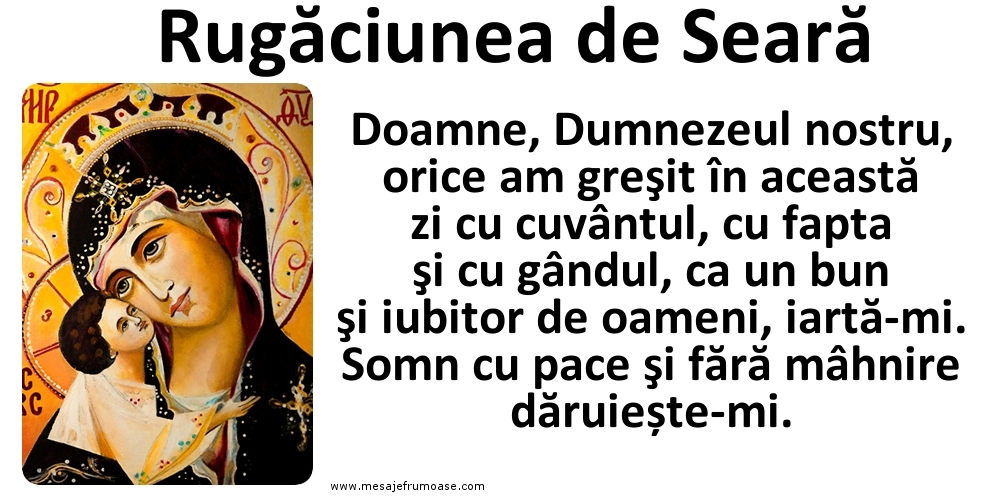 Doamne, Dumnezeul nostru, orice am greşit în această zi cu cuvântul, cu fapta şi cu gândul, ca un bun şi iubitor de oameni, iartă-mi. Somn cu pace şi fără mâhnire dăruiește-mi.