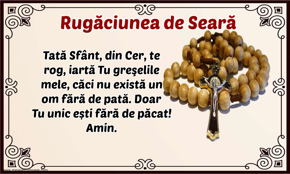 Tată Sfânt, din Cer, te rog, iartă Tu greşelile mele, căci nu există un om fără de pată. Doar Tu unic ești fără de păcat! Amin.