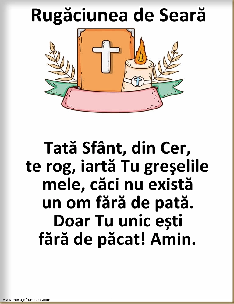 Tată Sfânt, din Cer, te rog, iartă Tu greşelile mele, căci nu există un om fără de pată. Doar Tu unic ești fără de păcat! Amin.
