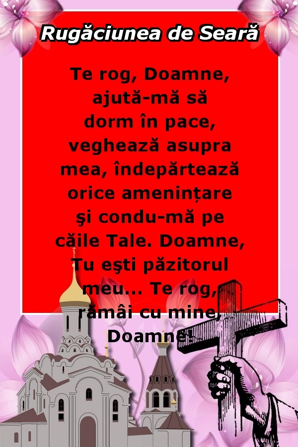 Te rog, Doamne, ajută-mă să dorm în pace, veghează asupra mea, îndepărtează orice amenințare şi condu-mă pe căile Tale. Doamne, Tu eşti păzitorul meu... Te rog, rămâi cu mine, Doamne!