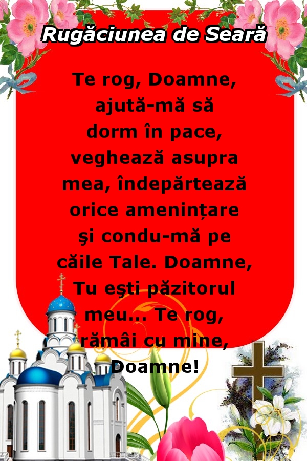 Această rugăciune de joi cu textul frumos Te rog, Doamne, ajută-mă să dorm în pace, veghează asupra mea, îndepărtează orice amenințare şi condu-mă pe căile Tale. Doamne, Tu eşti păzitorul meu... Te rog, rămâi cu mine, Doamne! ne îndeamnă să ne aplecăm inimile și să ne exprimăm recunoștința pentru tot ceea ce ne înconjoară, să ne rugăm pentru ghidare și înțelepciune în fața provocărilor și să ne susținem reciproc în călătoria noastră spirituală.