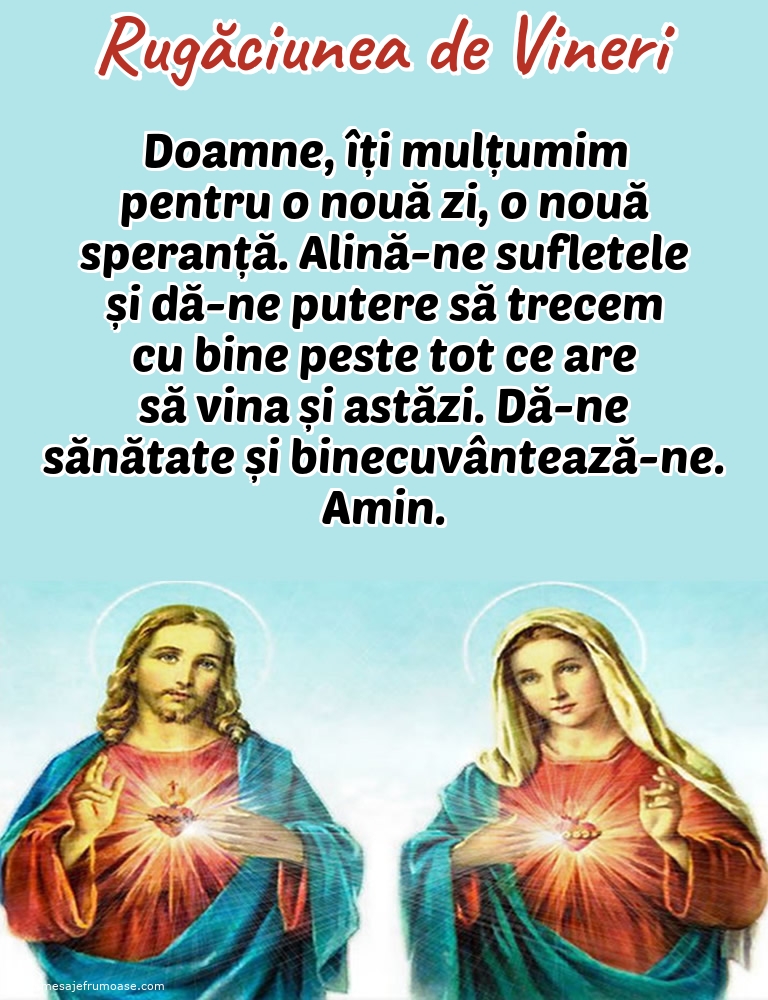 Această rugăciune de vineri cu textul frumos Doamne, îți mulțumim pentru o nouă zi, o nouă speranță. Alină-ne sufletele și dă-ne putere să trecem cu bine peste tot ce are să vina și astăzi. Dă-ne sănătate și binecuvântează-ne. Amin. ne îndeamnă să ne amintim de binecuvântările și realizările săptămânii care a trecut, să ne exprimăm recunoștința pentru călătoria noastră și să ne rugăm pentru odihnă și regenerare în weekendul ce urmează.